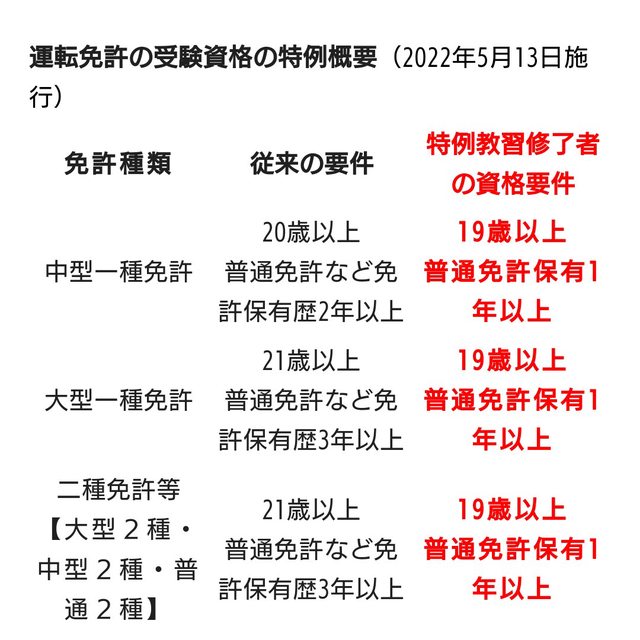 これまでは21歳以上+普通免許取得後3年だったけど法改正で19歳以上+普通免許取得後1年になったぞ